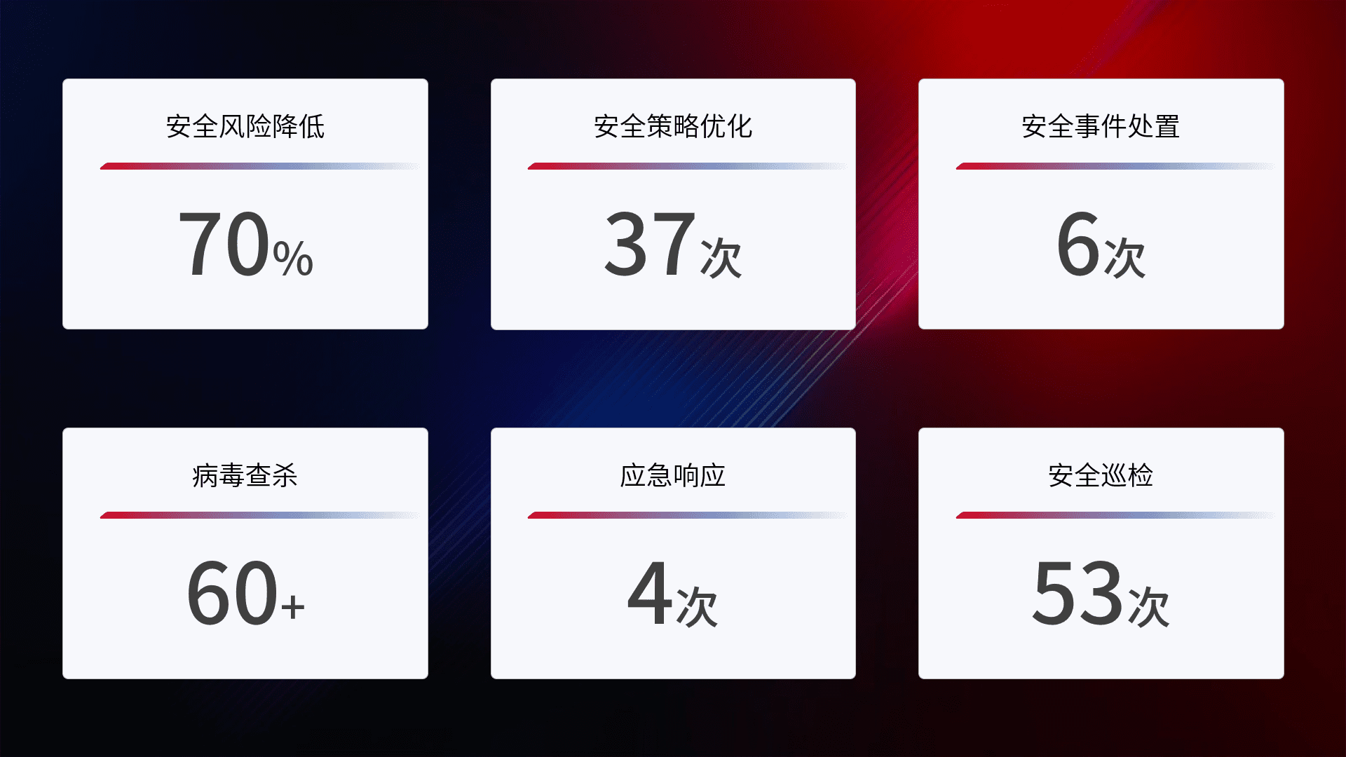 提供全面的安全事件报告体系,,包括处置报告、、、周报、、季度和年度总结,,结合持续监控,,帮助客户深入了解网络安全状况。。。